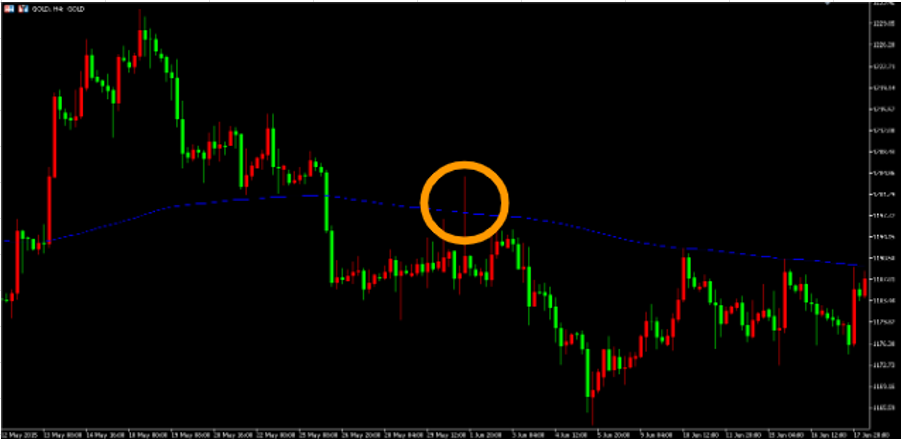 ・ローソク足が200SMAにタッチしたときに、長い上ヒゲを持っています。