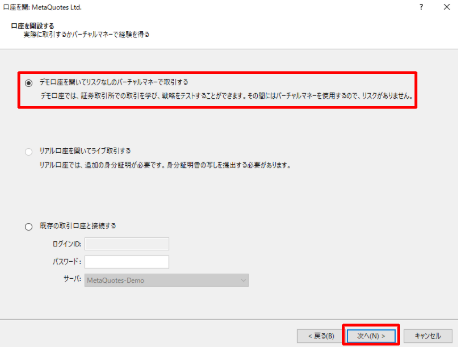 3.「デモ口座を開いてリスクなしのバーチャルマネーで取引する」を選択して「次へ」