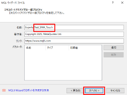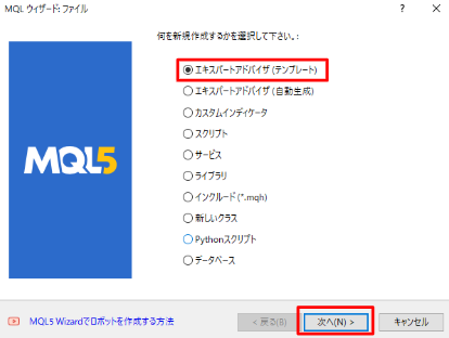 2.ウィザードから 「エキスパートアドバイザ(テンプレート)」 を選択して「次へ」